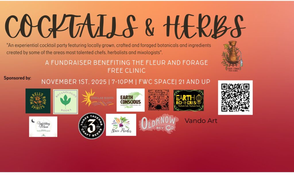 Come support the Fleur and Forage Free Clinic on November 1st from 7-10PM. We are hosting a cocktail and hors d’oeuvres party featuring local foods, herbs and creators.